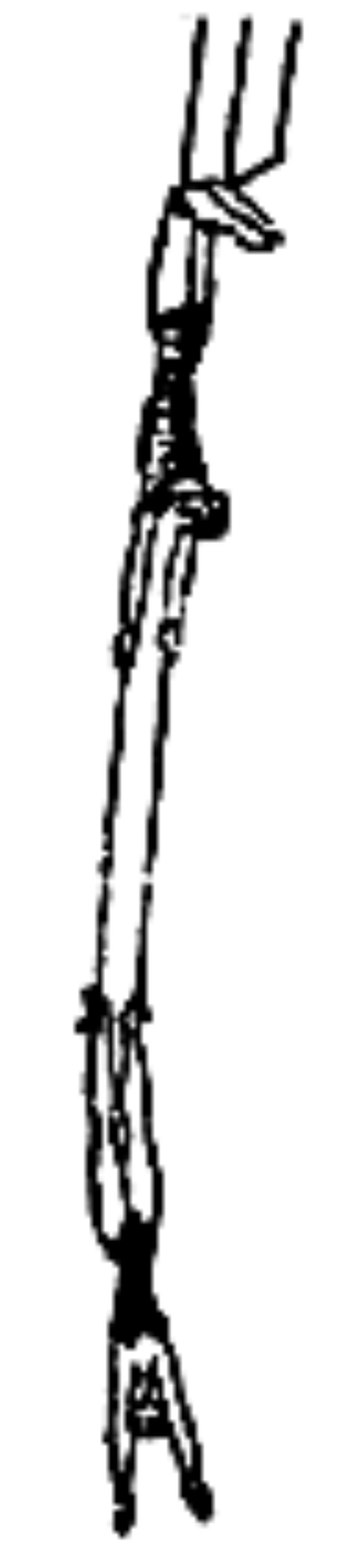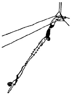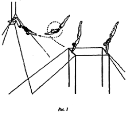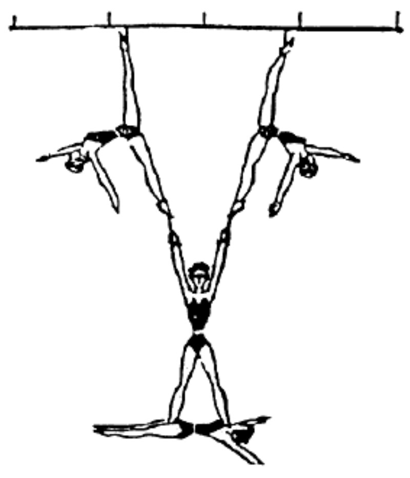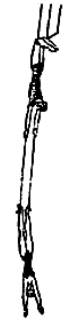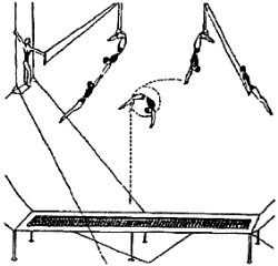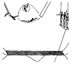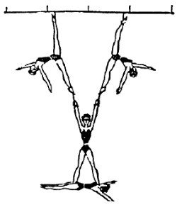 Двойная трапеция (доппель-трапе) предназначена для двух сквозных слов. Сначала они действуют, как бы не замечая друг друга. Затем одно из них повисает на подколенках, а другое, ухватившись за приставку партнера, "обрывается". При этом особенно важно ни на секунду не забыть, что вис на подколенках осуществляется без упоров или захватов носками строк (рис.3). В заключительной фазе слова, сплетаясь, вращаются вокруг грифа валетом или, вися на подколенках, слово-ловитор держит вращающегося в зубнике партнера: