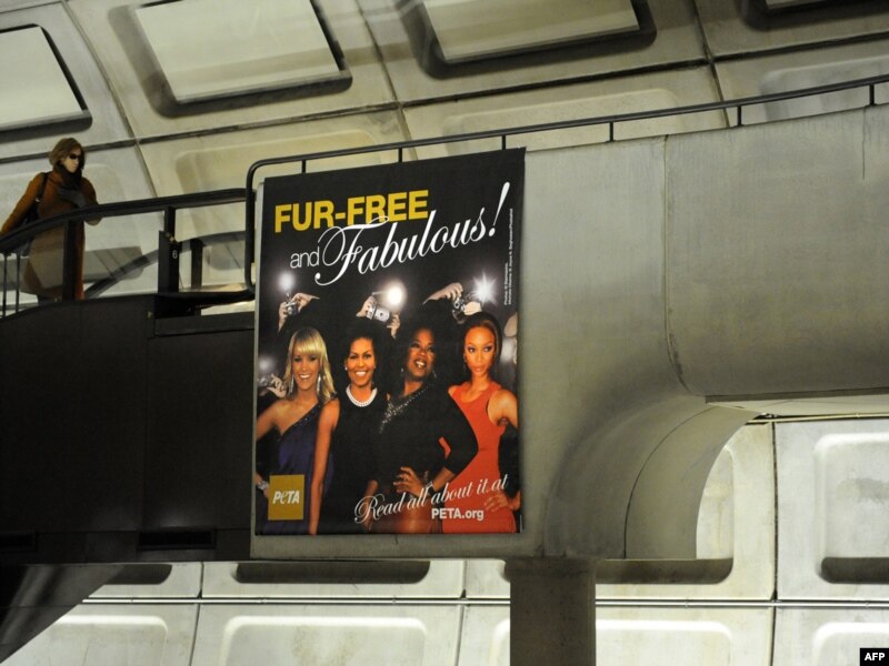 На днях станции вашингтонского метро украсились большим щитом крупнейшей американской организации за права животных – PETA. Рекламное полотно смонтировано из фотографий четырех эффектных и успешных женщин и сопровождается надписью "Великолепны без мехов!" Комплимент отпущен певице в стиле кантри Керри Андервуд, теледивам Опре Уинфри и Таре Бэнкс и первой леди Мишель Обаме.