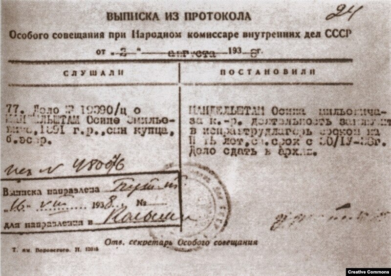 В части писательской среды весьма нервно обсуждается вопрос об Осипе Мандельштаме. Как известно, за похабные клеветнические стихи и антисоветскую агитацию Мандельштам был года три-четыре тому назад выслан в Воронеж. Срок его высылки окончился. Сейчас он вместе с женой живет под Москвой, за пределами зоны. Но, на деле, он часто бывает в Москве у своих друзей, главным образом - литераторов, его поддерживают, собирают для него деньги, делают из него страдальца, гениального поэта, никем не признанного. В защиту его открыто выступали Валентин Катаев, Иосиф Прут и другие литераторы. Выступали остро. С целью разрядить обстановку Мандельштаму была оказана материальная поддержка через ''Литфонд''. Но это не решает всего вопроса о Мандельштаме. Вопрос не только и не столько в нем, авторе похабных клеветнических стихов о руководстве Партии и всего советского народа, вопрос об отношении к Мандельштаму группы видных советских писателей. И я обращаюсь к вам, Николай Иванович, с просьбой помочь. За последнее время Мандельштам написал ряд стихотворений, но особой ценности они не представляют по общему мнению товарищей, которых я просил ознакомится с ними, в частности, товарища Павленко, отзыв которого прилагаю при сем. Еще раз прошу вас помочь решить этот вопрос о Мандельштаме.