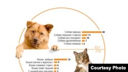 - У собак на первом месте такое качество, как верность и все, что с ним связано. Люди на улицах говорили анкетирующим, что, в отличие от кошек, собака никогда хозяина не продаст, что собака за хозяина горой. В кошках больше всего людям нравится нежность и доброта. Люди говорили такие слова: "Кошка нежная, как дитя". На втором месте - это немножко смешно, но людям очень нравится, что кошки пушистые, что они мурлыкают. Это вторая популярная причина. Дословные цитаты звучат так: "Взял кошку на колени, начал гладить, остановиться не могу". В собаках, помимо верности, люди ценят то, что они защитники, что они, в отличие от кошки, и в современных условиях не потеряли какую-то пользу. Мышей ловить в квартирах, - это, наверное, не очень актуально сейчас, а вот защита, оборона всегда актуальна. Людям нравится в собаке то, что она - защитник.