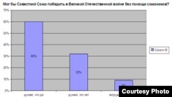 К 70-ой годовщине начала Великой отечественной войны Левада-центр задал россиянам несколько вопросов. Чем, например, было вызвано то, что потери Советского Союза в этой войне значительно превышают потери Германии? «Внезапностью нападения», - отвечают 29% опрошенных. «Военным и техническим превосходством Германии», - 26%. «Тем, что сталинское руководство действовало, не считаясь с жертвами», - таково мнение 18 % респондентов. 13% граждан отвечают: «слабостью, неумелостью советского командования». И 10% россиян полагают, что все дело в жестокости гитлеровцев. Подавляюще большинство опрошенных, 60%, думают, что Советский Союз мог бы победить в этой войне без помощи союзников, противоположного мнения придерживаются 32% граждан. Фильмы, снятые о войне в последнее десятилетие, большинству людей нравятся, однако 32% все же считают, что в целом они хуже, чем те, которые снимались в советские времена.