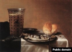 Юная голландская селедка того стоит. Но еще дороже она мне на любом из тех бессчетных ''завтраков'', которыми нас кормят голландские натюрморты. У Питера Клааса чуть другая, но столь же умело разделанная рыба лежит на тусклом оловянном блюде. В этом скудном, почти монохромном холсте трудно найти источник холодного, как от болотных огней, света. Присмотревшись к кухонной драме, зритель с волнением открывает, что светится сама сельдь, чуть заметно паря над тарелкой в нимбе фотонов. Попав из воды в масло, люминесцирующая рыба преобразилась в родную сестру тех, которыми Иисус накормил голодных. Чудо изобилия. Манна Северного моря. Такой селедкой можно причащаться, клясться, завтракать.