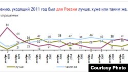 Вероника Боде: В целом прошедший год был удачным, - об этом сообщают половина опрошенных Левада-Центром. Как неудачный его оценивают почти вдвое меньше – 26% респондентов. Фонд «Общественное мнение» также просил россиян оценить 2011 год и назвать его главные события. Вот наблюдения Ларисы Паутовой, директора проекта «Терри».