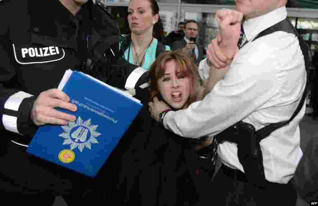 Активистки движения Femen устроили акцию на промышленной ярмарке в Ганновере, когда ее осматривали канцлер ФРГ Ангела Меркель и президент России Владимир Путин.