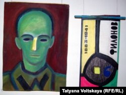 Зал с работами Кордобовского и Калужнина словно двухэтажный: вверху, над картинами, он опоясан большими фотографиями времен войны и блокады. На одной из них запечатлен военный фотограф Александр Бродский, отец Иосифа Бродского, есть и кадры, которые сделал он. Так что картины как бы погружены в призрачный воздух времени.