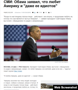 "Президент США Барак Обама, выступая с обращением по радио к американскому народу, заявил, что любит Америку и её жителей, даже если они – "идиоты", сообщил русскоязычный сайт RT, сославшись на сообщение РИА Новости, которое перевело публикацию в журнале New Yorker.