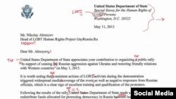 "Известия" в пылу борьбы за внутренний ИГИЛ опубликовали фальшивое письмо от Госдепа гей-активисту Алексееву. Там не только невозможный английский, там сам тип документа невозможный. Выдавала только звезда героя на груди и парашют за спиной.