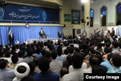 Верховный лидер Ирана аятолла Али Хаменеи говорит студентам: “Иранцы идут вперед, и произошедшие сегодня взрывы хлопушек никак не повлияют на волю народа”.