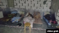 Вдоль стен стоит несколько раскладушек. В центре – стол из листа плотного картона, положенного на кирпичи, вокруг него на ходунках делает свои первые шаги маленькая девочка. Люди сидят в пуховиках, в валенках, греются горячим чаем.