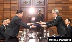 Северная и Южная Корея договорились, что Пхеньян направит оркестр из 140 музыкантов на Олимпиаду в Пхёнчхане. На фотографии документами об этом обмениваются главы соответствующих бюро в министерствах культуры двух Корей (представители Северной, как можно догадаться, слева).