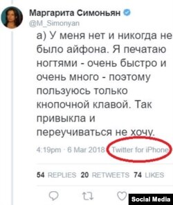 Комментаторы обратили внимание Симоньян на это противоречие, вынудив ее оправдываться. Объясняя, почему твит о том, что у нее никогда не было айфона, написан с айфона, главный редактор RT призналась, что некоторые твиты за нее "постят специальная очень хорошая девочка или мальчик" (причем и сам этот твит с объяснением, получается, постил кто-то из них – он снова написан с айфона):