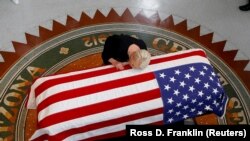 Гроб с телом сенатора, который в пятницу был установлен в Ротонде Капитолия - здания Конгресса США - перевезли в кафедральный собор. Траурный кортеж по пути остановился у национального мемориала войны во Вьетнаме, участником которой был Маккейн, его жена Синди возложила венок в память о погибших.