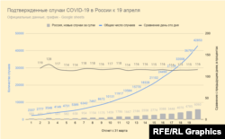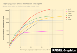 6 тысяч новых подтвержденных случаев за сутки – по этому показателю Россия, по всей видимости (если сравнивать со статистикой по другим странам от вчерашнего дня), уступает только США, где ежедневно фиксируется в районе 30 тысяч случаев. Это примерно вровень с Великобританией – и это уровень на пике эпидемии в Италии и уже недалеко от уровня пика эпидемии в Испании (свыше 9 тысяч в день). Однако в Италии и Испании пик пройден, в США и Великобритании, по всей видимости, достигнут. В России пока признаков замедления нет, хотя общее число случаев приблизилось к 50 тысячам (на логарифмической шкале график России все еще выглядит прямой – но можно надеяться, что по примеру других стран примерно на этом же этапе эпидемии график вот-вот начнет "выравниваться").