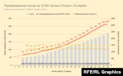 Падает процентный прирост новых случаев за сутки, а если брать скорректированный график, учитывающий уровень тестирования – то есть число новых случаев на 10 тысяч тестов, то там темпы падения еще быстрее и приближаются к уровню 100 процентов – то есть отсутствию роста эпидемии.