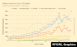 По данным на 23 апреля, в столице зарегистрировано 33 940 случаев заражения COVID-19, суточный прирост составил 1959 человек. Таким образом, заболеваемость в городе вернулась к показателю шестидневной давности, и второй день подряд наблюдается снижение регистрируемых случаев инфицирования примерно на 500.