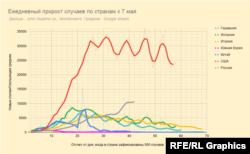 Ежедневный прирост новых случаев устойчиво держится в России выше 10 тысяч в сутки последние несколько дней, с тех пор как в стране стали, по официальным данным, делать 200 тысяч тестов в сутки (этот скачок хорошо виден на графике). В сравнении с другими странами видно, что в России эпидемия развивается медленнее – но в результате пока даже нет уверенности, что страна достигла пика.