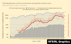Если брать отношение подтвержденных случаев к количеству тестов, то этот показатель медленно снижается от уровня 6 процентов – то есть из 100 тестов на вирус около 6 оказываются положительными.