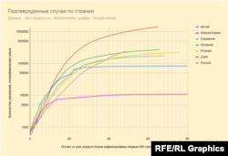 Российские власти вчера возмутились из-за публикаций о том, что в России от коронавируса могло умереть больше людей, чем сообщается официально, и одновременно фактически признали, что учитывают смерти иначе, чем рекомендует ВОЗ (а следование рекомендациям увеличило бы статистику). Внимание к российским данным привлекло, очевидно, странное расхождение: Россия среди лидеров по числу случаев, но количество смертей гораздо ниже других стран. Вот сравнительный график подтвержденных случаев в некоторых государствах.