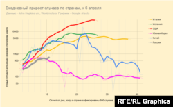 Однако скорость развития эпидемии в России пока выглядит ниже темпов в других странах, где эпидемия развивалась по наиболее тяжелому сценарию, – таких как Италия, Испания или США, хотя уже превзошла уровень Южной Кореи, где вспышку заболевания купировали очень быстро. Однако сейчас в Италии и Испании ежедневно регистрируется все меньше новых случаев – в США и России этот показатель продолжает расти.