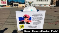 Активист вышел на пикет в защитном костюме и респираторе – средствах защиты от инфекции. Он держал плакат, на котором был коллаж с изображением Путина и коронавируса и текст с утверждением: "В России 20 лет коронавирус", а также стихи: