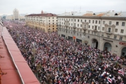 Тысячи людей, проходя мимо здания МВД, скандируют: "Караева в тюрьму!" (Юрий Караев – министр внутренних дел Беларуси. – Прим. РС). Возле здания КГБ в Минске люди скандируют: "Не забудем – не простим", "Трибунал!", "Свобода!", "Освободи!"
