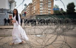 У другого католического костела – Красной церкви, где сегодня сменили замки, прошел крестный ход, который сопровождала милиция, верующих снимали люди в штатском.