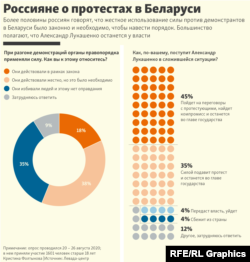 Согласно опросу "Левада-центра", более половины россиян уверены, что действия белорусских силовиков при разгоне протестов были оправданы.
