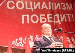 Генадий Зюганов уверен, что социализм победит, когда-нибудьЕго выступление прошло в знакомом антураже красных знамен, советской эстрады, пионеров и социалистические лозунги.