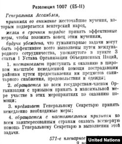 6-я из 10 состоявшихся в истории ООН таких сессий состоялась в 1980 году после ввода советских войск в Афганистан, а вторая – в 1956 году после подавления СССР Венгерского восстания. Вот фрагмент одной из принятых во время нее резолюций: