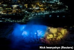Величественная картина: "Американский водопад" и водопад "Фата", часть самого мощного в Северной Америке Ниагарского водопада, освещены цветами украинского флага