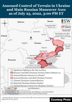 Аналитики ISW публикуют и карту, на которой обозначены районы интенсивных боевых действий: