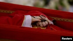 Как сообщает Reuters, Ватикан распространил фотографии папы Франциска, лежащего в литургических облачениях в открытом деревянном гробу, установленном в часовне резиденции Санта-Марта — именно там он проживал с начала своего понтификата, отказавшись от традиционных покоев Апостольского дворца. Почётный караул у гроба несут швейцарские гвардейцы.